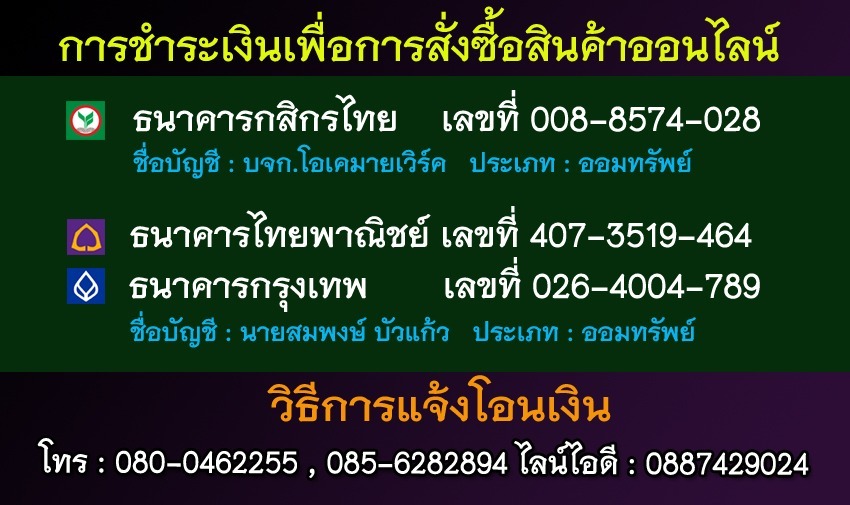 สำหรับลูกค้าที่มีความพร้อม สามารถโอนเงินค่าสินค้าเข้ามาก่อนตามบัญชีธนาคาร ที่ลูกค้าสะดวก เรามี 2 ธนาคารคือ ธ.กสิกรไทย และ ธ.กรุงเทพ (สำหรับการโอนเงิน ผ่านทาง ATM หลังจากโอนเสร็จให้แจ้งสลิปด้วยนะครับ)